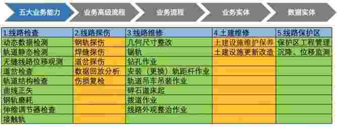 在轨道运维业务中,,,,,,,我们形成了完整的从业务能力(业务域)-业务流程-业务实体-数据模型的分析梳理过程。。。。。。轨道运维业务能力如下图所示::::::::::::
